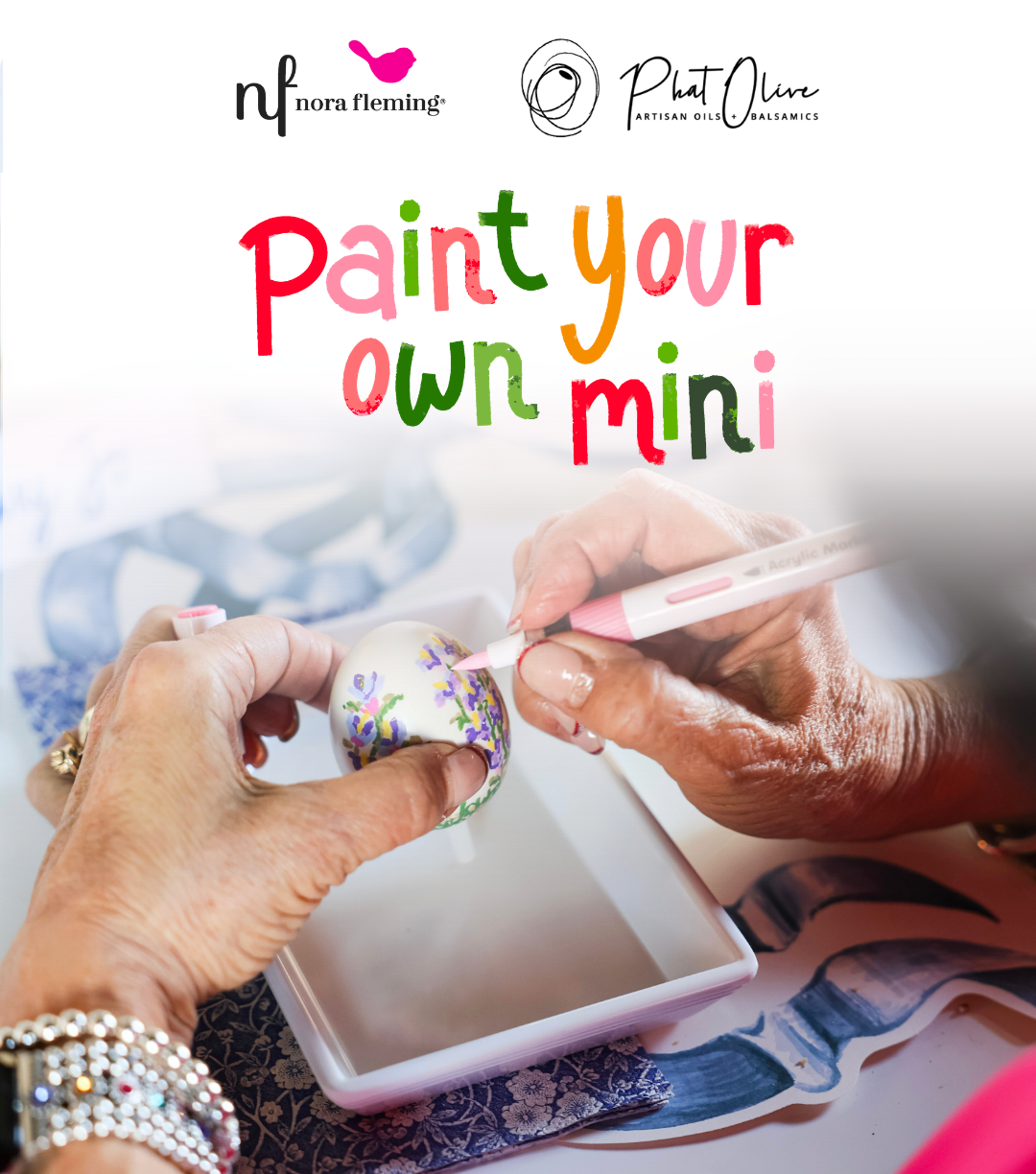 Each guest receives a Nora Fleming teeny tray and one blank egg mini to paint and take home. Just bring your creativity. All painting supplies will be provided. Enjoy refreshments including a balsamic cocktail, raffle entry, Nora Fleming gift bag, and private shopping with 20% off all Phat Olive purchases (excluding Nora Fleming products).
